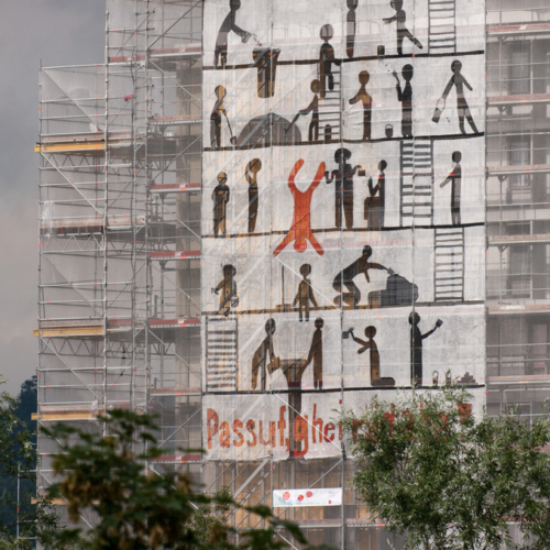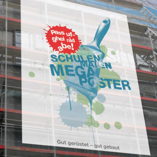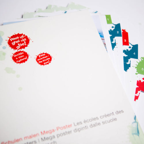 259 Schulklassen nahmen teil, eine Jury wählte aus 757 eingereichten Zeichnungen die 30 besten aus, die auf ein 10 x 14 Meter grosses Gerüstnetz übertragen wurden. Mit den Riesenpostern sollen die Planer, die Gerüstbauer und besonders auch die Gerüstbenutzer für die Gefahren sensibilisiert werden. Gleichzeitig setzten sich durch die Projektarbeit auch die Lehrpersonen und Schülerinnen und Schüler mit Risiken und Gefahren im Alltag sowie den eigenen Erfahrungen auseinander. In einer modularen Arbeitsbox erhielten sie vielfältige Informationen, Anregungen und Materialien rund um Sturzgefahren und den Malwettbewerb, z.B. zu Themen wie «Stürzen und Fallen», «Erkennen von Gefahren» und «Risikoeinschätzung», die sich an der Erfahrungswelt der Kinder und Jugendlichen orientieren.